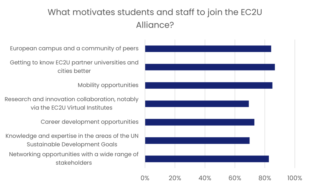 When asked what motivated them to participate in EC2U activities, mobility opportunities, multi-cultural experiences, and networking were put forth as the main reasons.