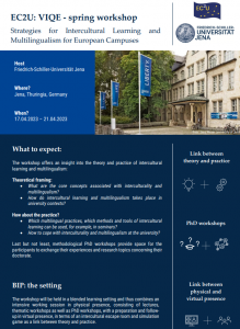 The workshop will be held in a blended learning setting, integrating virtual and in-person elements. It combines a digital phases for preparation and follow-up with an intensive working phase in physical presence in Jena, consisting of lectures, thematic workshops as well as workshops for PhD exchange. The virtual phases include an intercultural simulation game, linking theory with practice and concluding in an online evaluation of the whole workshop. Participants will discuss and reflect the workshop regarding its potential for higher education teaching in multilingual and multicultural contexts. The digital preparation will take place in the week before the workshop begins, the virtual follow-up within the following weeks of the phase in Jena.