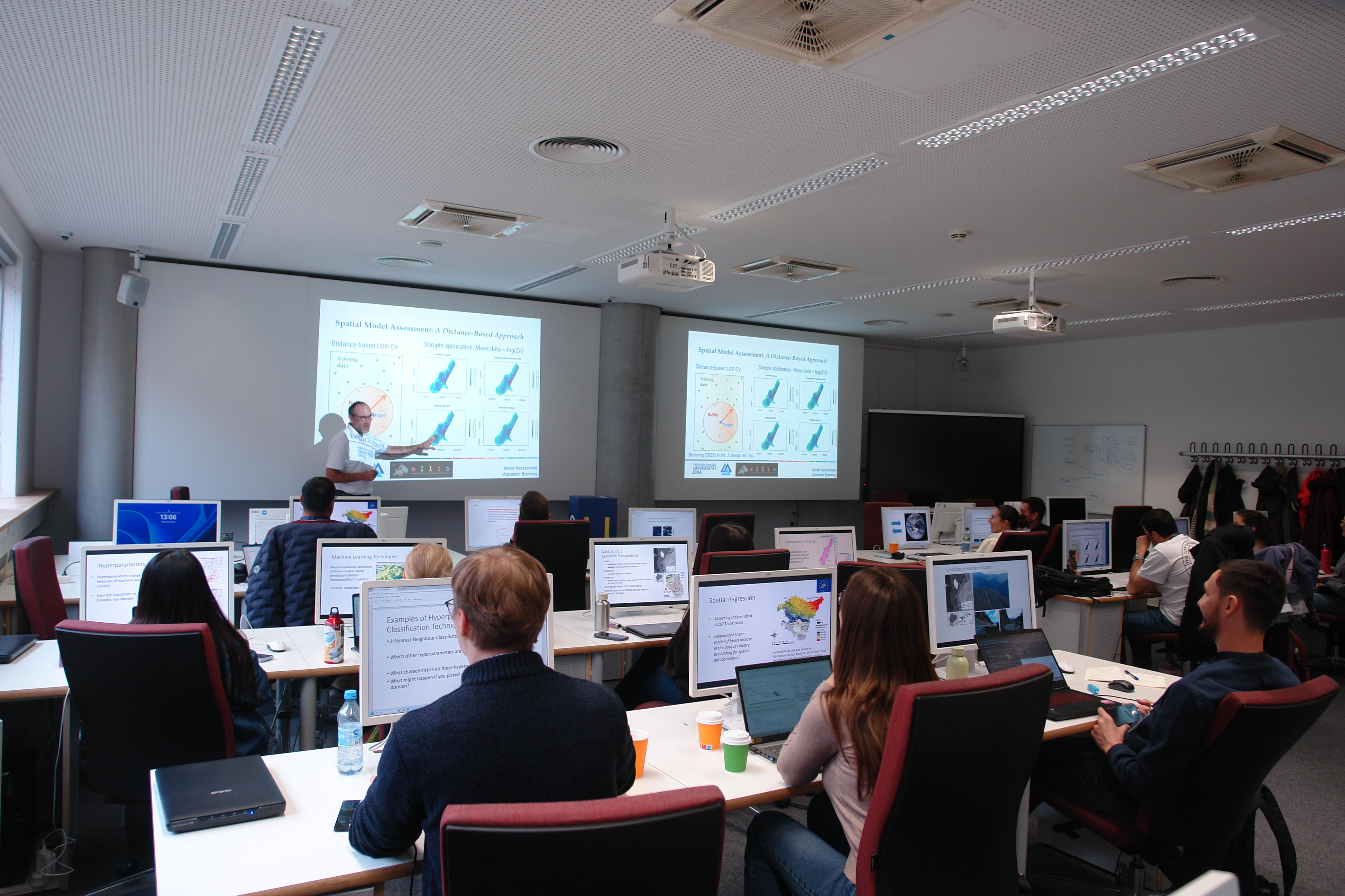 At the Multimedia Center of the University, participants learnt about challenges in the analysis of geospatial data related to integrating process knowledge, interpreting black-box models, and accounting for spatial autocorrelation. Since operating these models requires statistical computing skills, the course also introduced the programming language R with its geospatial capabilities and machine-learning extensions.