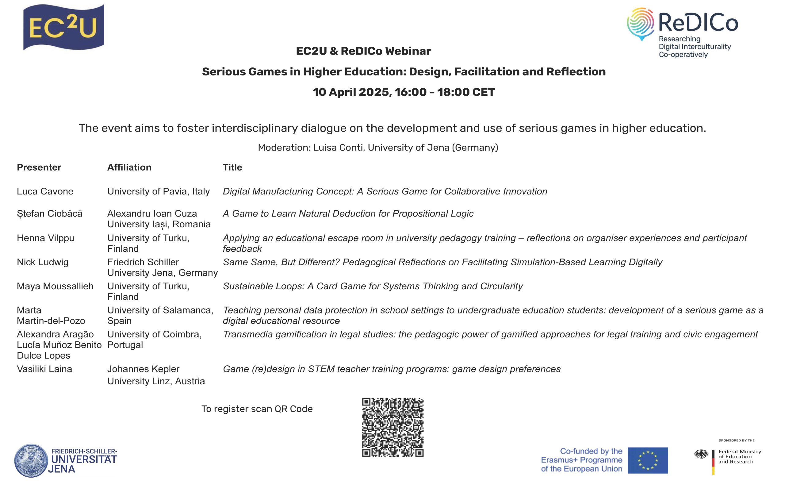 Are you a teacher or researcher interested in innovative pedagogical tools? Do you want to discover how Serious Games can be designed and used to enhance learning experiences? Join us online on April 10, 2025, from 16:00 to 18:00 CET for the EC2U & ReDICo Webinar "Serious Games in Higher Education: Design, Facilitation, and Reflection".