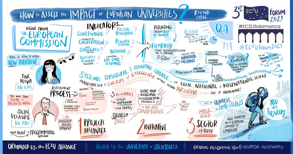 The 2nd day of the Forum started with a round table entitled “How to assess the impact of European universities?”. After the broadcasting of an introductory video of Frédérique Vidal, French Minister for Higher Education, Research and Innovation, the representatives from other alliances and networks gave their views on the given topic: