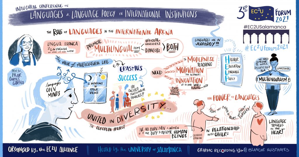 The organisation of this 3rd EC2U Forum was the responsibility of the University of Salamanca and it was the first one that made it possible for the EC2U community to meet face-to-face, taking place in a hybrid mode, as people could also join the meeting via a remote connexion.